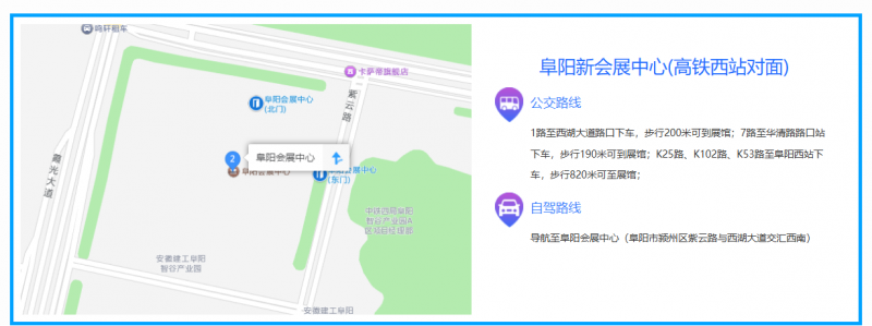 1路至西湖大道路口下车,步行200米可到展馆;7路至华清路路口站下车,步行190米可到展馆;K25路、K102路、K53路至阜阳西站下车,步行820米可至展馆;