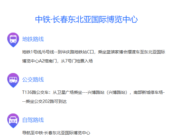 地铁1号线/6号线--到华庆路地铁站C口,乘坐蓝装家博会摆渡车至东北亚国际博览中心A2馆南门,从7号门检票入场